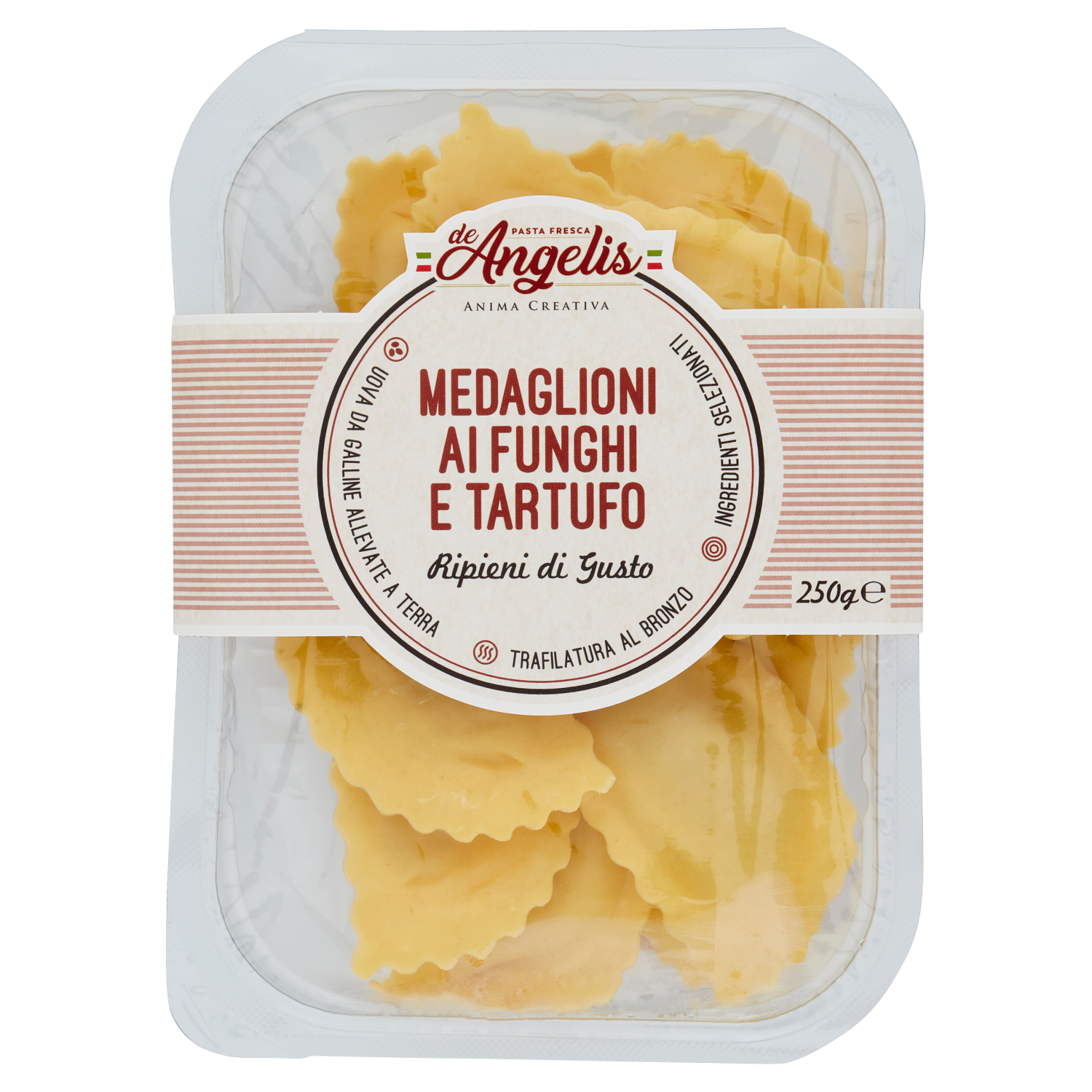 töltelék (52%) (ricotta (33%) (tejsavópor, tej , tejszín, só ), gombás-szarvasgombás krém (26,3%) (csiperke gomba (79,04%), napraforgóolaj, hagyma , szárított vargányagomba (2,0%), só , zöldséglé ( só , élesztő kivonat, szacharóz, napraforgóolaj, hagymapor, fűszerek), rizsliszt, fekete szarvasgomba (0,5%), fokhagyma por, szarvasgomba aroma, élesztő kivonat, tejsav (E270), bors, cukor, aszkorbinsav (E300)), zsemlemorzsa ("0" típusú búzafinomliszt, víz, só ), vaj, Grana Padano DOP ( tej , só , oltó, tojás lizozim), só , napraforgóolaj, extra szűz olívaolaj, aromák, petrezselyem, fokhagyma), tészta (48%) (durumbúza dara, "00" típusú búzaliszt, tojás (20%), víz)