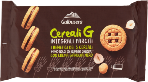 A Galbusera teljeskiörlésű mogyorókrémmel töltött keksz egy ízletes olasz finomság, mely tökéletes választás reggelire vagy uzsonnára.