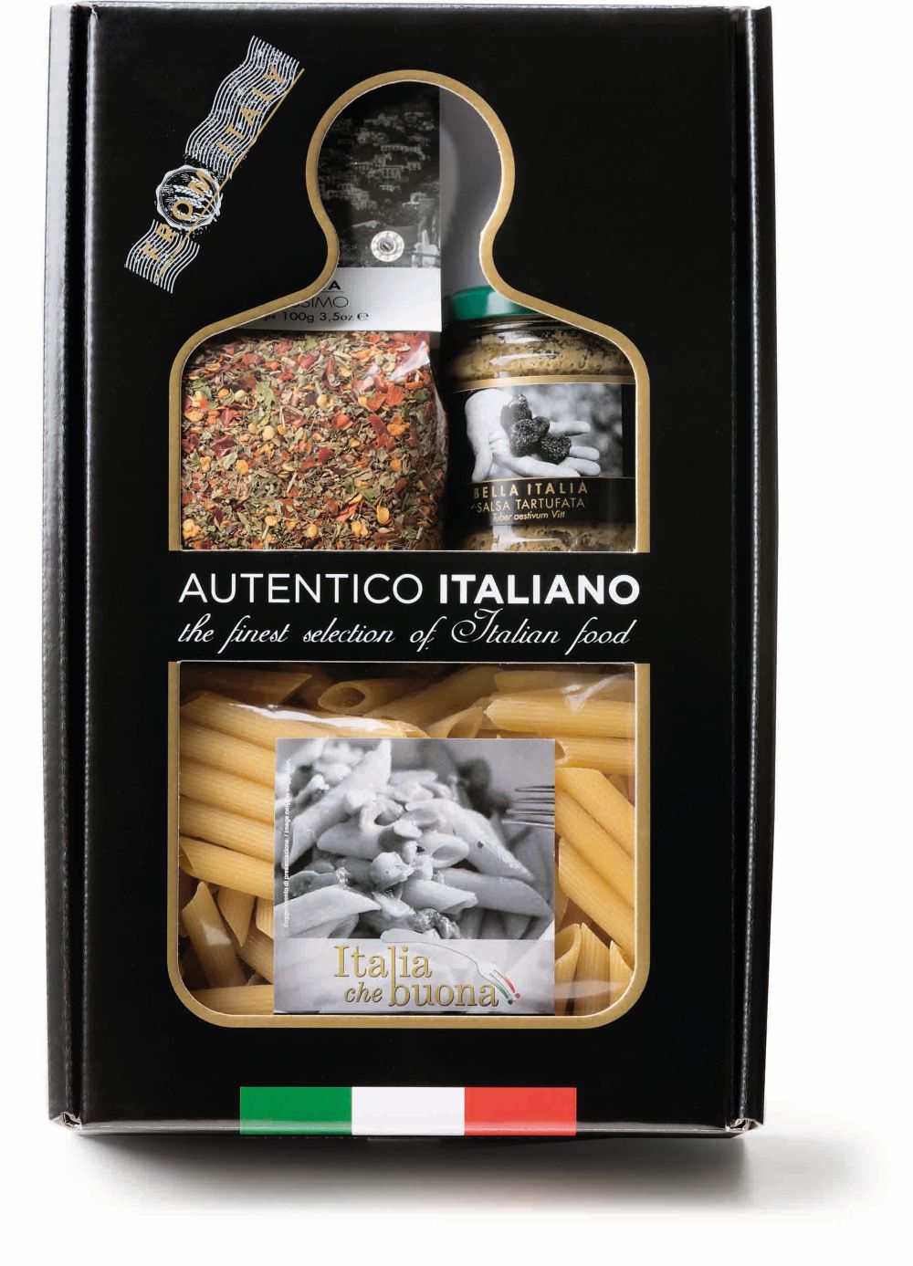 tészta (durumbúza dara), Nyomokban tartalmazhat (szója, mustár), szarvasgombás szósz (csiperke gomba (63%), extra szűz olívaolaj, vargánya gomba (7%), fekete olívabogyó , fekete nyári szarvasgomba (2%), dehidratált petrezselyem, só , természetes aromák, fokhagyma, savanyúságot szabályozó anyag (tejsav (E270)), aromák, Nyomokban tartalmazhat (földimogyoró, tej , diófélék)), fűszerkeverék (chili paprika (49%), bazsalikom, fokhagyma, só , petrezselyem, Nyomokban tartalmazhat (glutén, tojás, földimogyoró, kesudió, zeller))