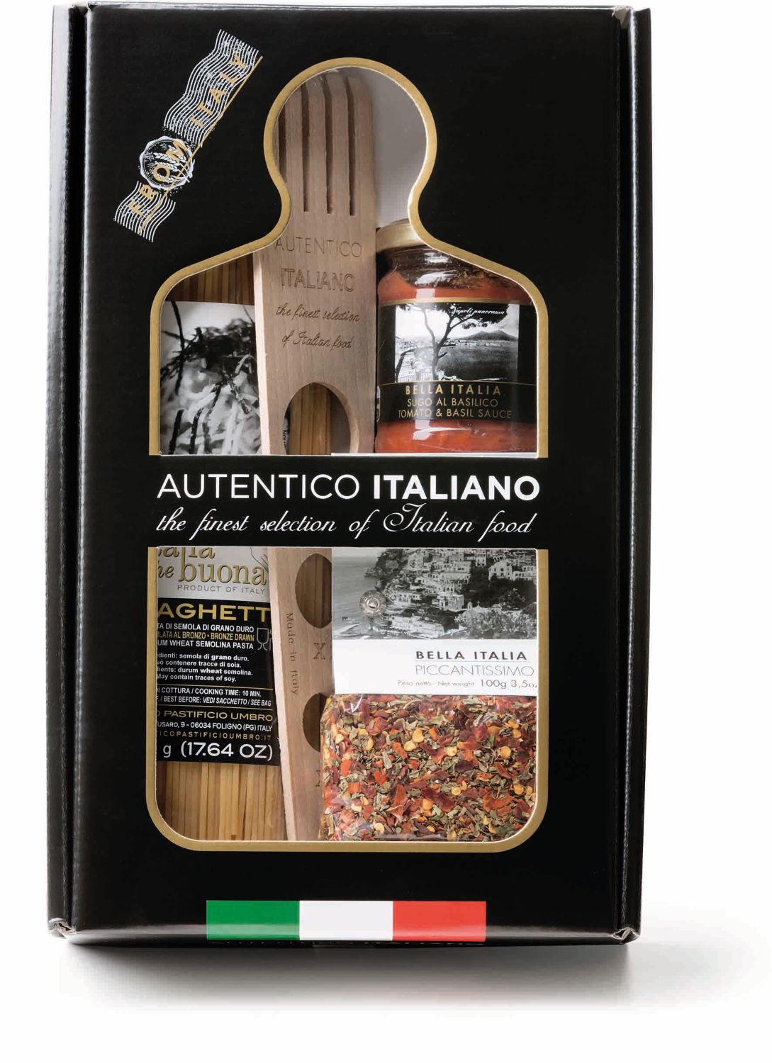 Az Umbro ajándékcsomag fekete színével elegáns megjelenést biztosít a konyhában, emellett a spagetti mérő segítségével könnyedén adagolható a tészta a főzés során.
