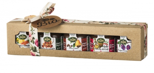 A Alpa Bio lekvár-krém szett 5x40g dísz egy igazi gasztronómiai különlegesség, mely öt különböző ízű lekvár-krémet tartalmaz.