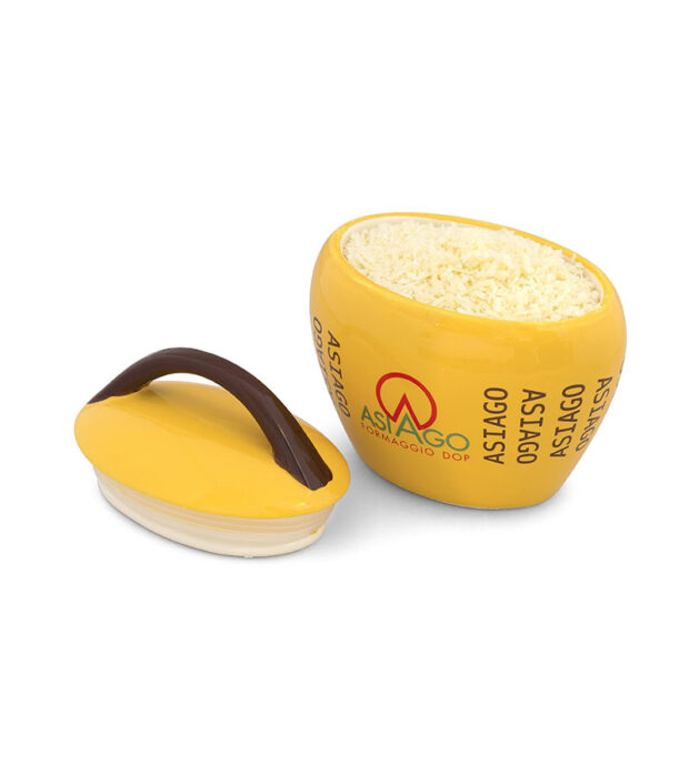 Kerámia kolomp alakú sajttál, amellyel a reszelt sajtot az asztalon, otthon vagy étteremben tálalhatja. A kolomp jellegzetes formája ihlette az új sajttál dizájnját, amelyet az Asiago márka személyre szabott.