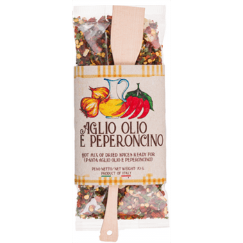 Az aglio-olio-peperoncino fűszer csomag ideális választás a klasszikus spaghetti aglio e olio vagy a csípős penne all'arrabbiata elkészítéséhez.
