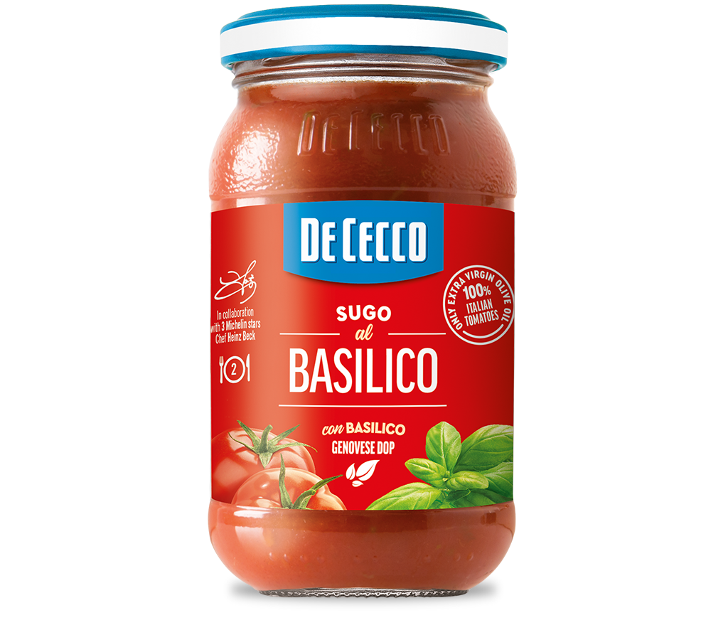 A De Cecco bazsalikomos szósz ideális választás a Caprese saláta, pizza margherita és bruschetta elkészítéséhez.