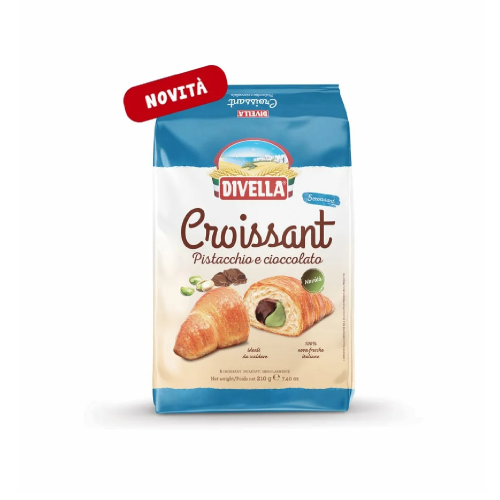 A Divella csokis-pisztáciás croissant ideális reggelire vagy desszertként is. Kiválóan párosítható egy csésze aromás kávéval vagy forró csokival.