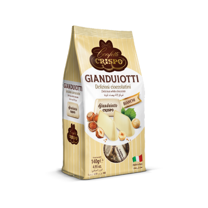 A Crispo gianduiotti fehér gazdag, lágy ízvilága harmonikusan ötvözi a fehér csokoládé és mogyoró ízeit, egy valódi olasz édes élményt nyújtva.