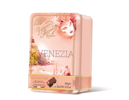 A Vergani Venezia praliné fém dobozban egy luxus csokoládé válogatás, melyben az olasz édességkészítés mestereinek tudása ötvöződik.