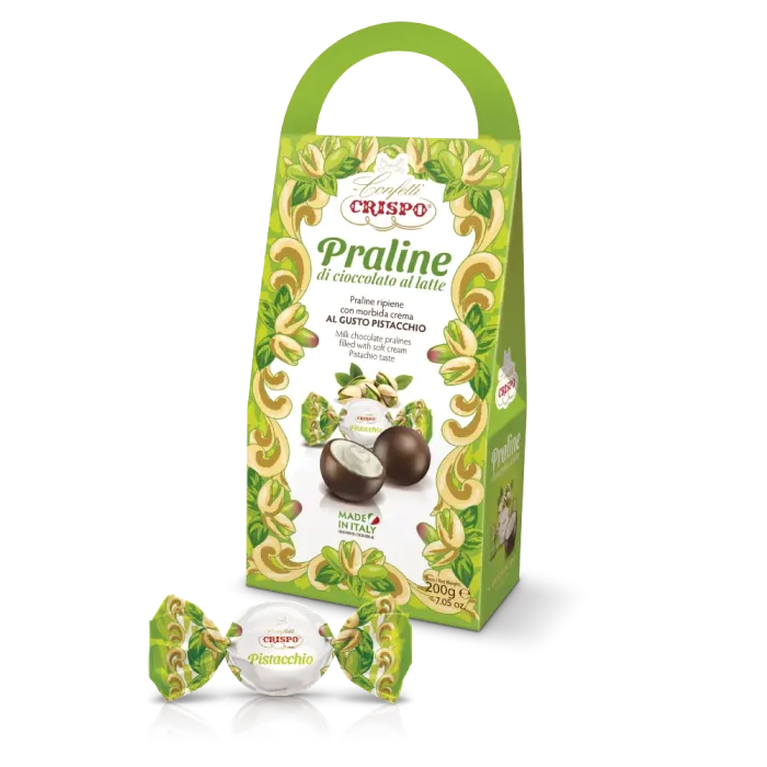 Élvezd a Crispo pisztáciával töltött tejcsokoládé pralinéinak édes ízét. Ezek a finom pralinék a csokoládé lágyságát ötvözik a pisztácia gazdag ízével. Tökéletesek azok számára, akik egy kis édes kikapcsolódásra vágynak a nap folyamán. A gazdag töltelék és a minőségi csokoládé tökéletes választássá teszi ezeket a pralinékat minden édesszájú számára.