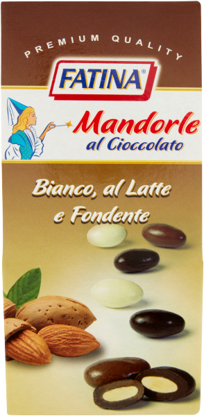 bevonat (70%) (tejcsokoládé (min. 31% kakaótartalom) (cukor, kakaóvaj, teljes tejpor, kakaómassza, emulgeálószer: szójalecitin, természetes vanília aroma), étcsokoládé (min. 50% kakaótartalom) (cukor, kakaómassza, kakaóvaj, emulgeálószer: szójalecitin, természetes vanília aroma), fehércsokoládé (cukor, kakaóvaj, teljes tejpor, sovány tejpor, emulgeálószer: szójalecitin, természetes vanília aroma)), mandula (30%), bevonószer (gumiarábikum (E414), sellak)
