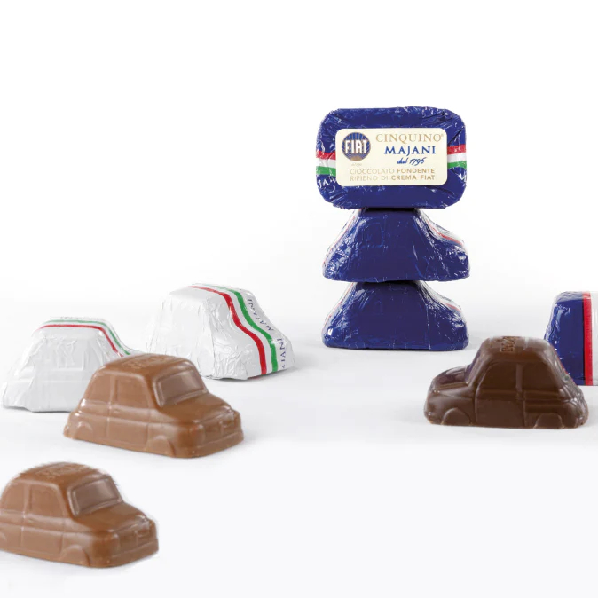 A Majani FIAT töltött csokoládé kisautó egy kis csokoládé autócska, amelyben az olasz édesség világ és a játékosság találkozik.