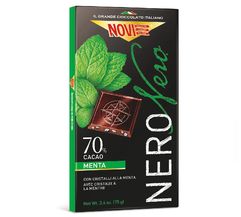 A Novi Nero 70%-os mentás étcsokoládé egyedülálló ízvilággal rendelkező csokoládé, amely megnyugtató menta frissességet és intenzív csokoládé ízeket ötvöz.