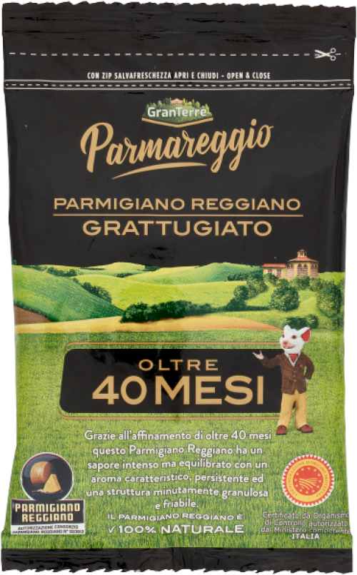 A 40 hónapos reszelt parmezánsajt igazi csemegének számít az olasz ízek kedvelői számára, melyet a legmagasabb minőségű alapanyagokból készítenek.