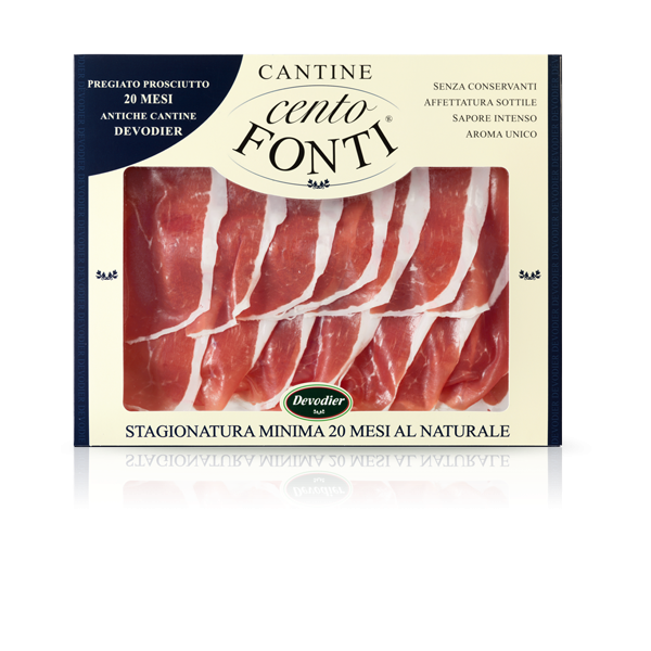 A Parma-völgy legszellősebb ősi pincéjében legalább 20 hónapig érlelt prosciutto crudo. Tartósítószermentes érlelés, vékonyra szeletelve, magával ragadó ízzel és összetéveszthetetlen aromával jellemzi.