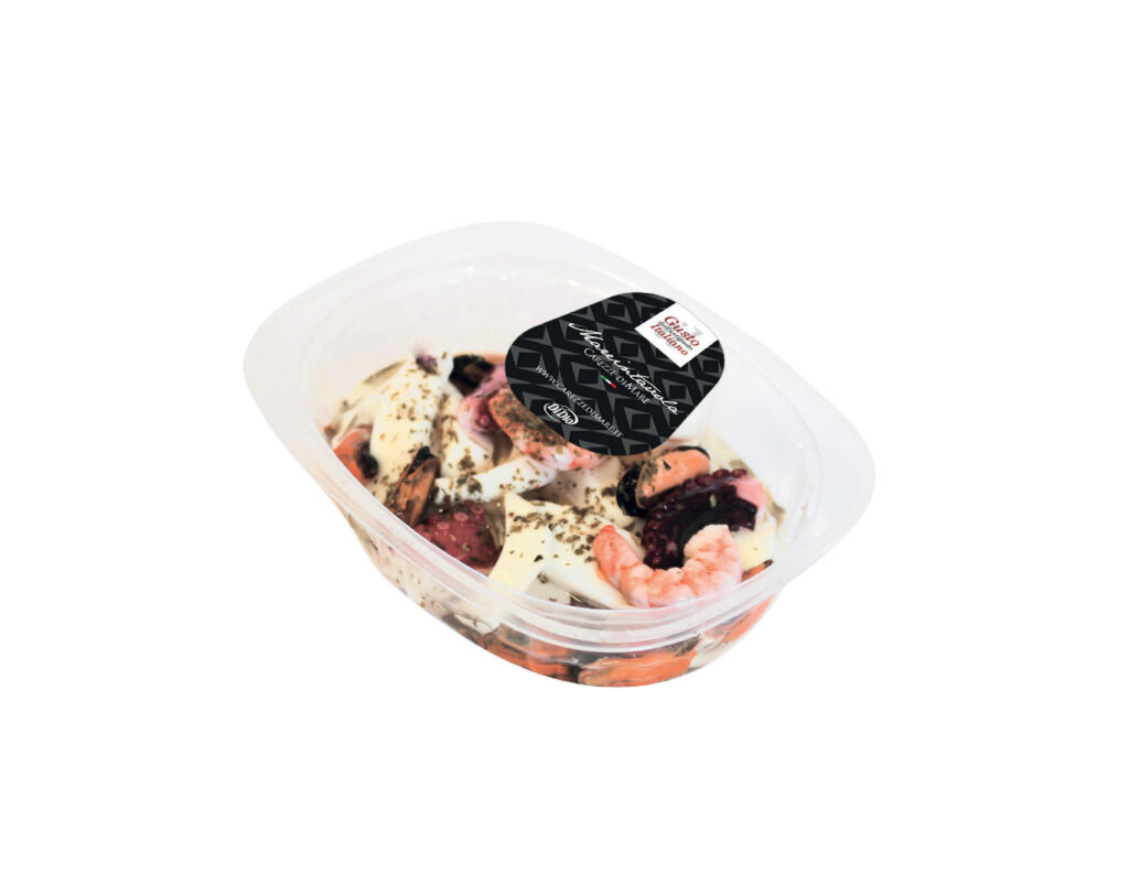 tintahal, Ismeretlen csoport (Ismeretlen összetevő, víz, búzakeményítő, tojásfehérje, rák, só , cukor, Ismeretlen összetevő, szójaolaj, stabilizátor (szorbit (E420)), rák, kálcium-karbonát (E170), kapszantin (E160c)), polip, tintahal, garnélarák, kagyló, napraforgóolaj, borecet, só , fruktóz, petrezselyem, savszabályozó: tejsav (növényi), antioxidáns: aszkorbinsav, tartósítószer: kálium-szorbát, természetes aromák