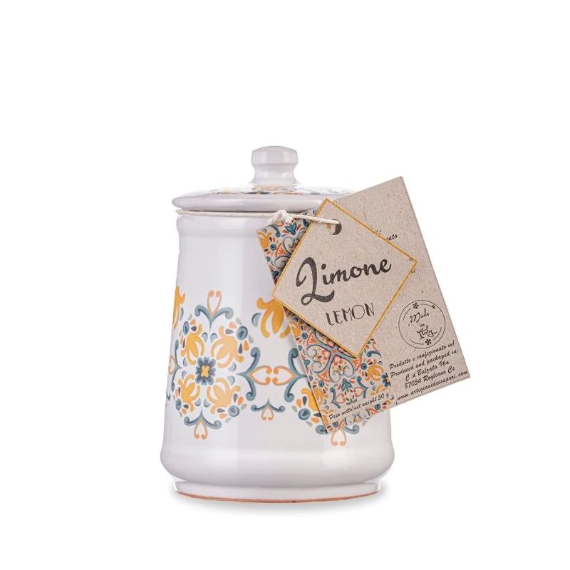 Kézzel készített olasz kerámiaedényben, a szárított, őrölt citrom nemcsak megőrzi a frissességet, hanem konyhája esztétikai megjelenését is fokozza.