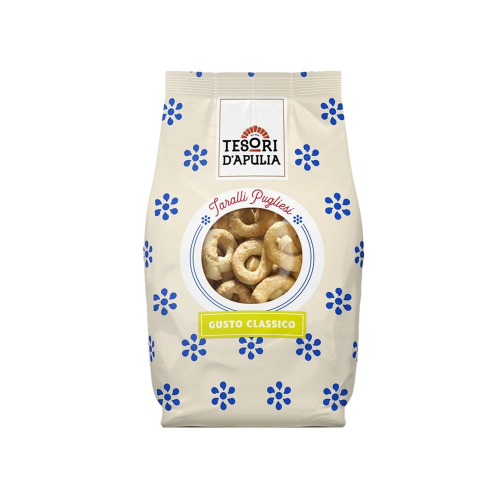 A Tesori taralli klasszikus egy ízletes olasz ropogtatnivaló, mely tökéletes választás reggelihez vagy délutáni uzsonnára.