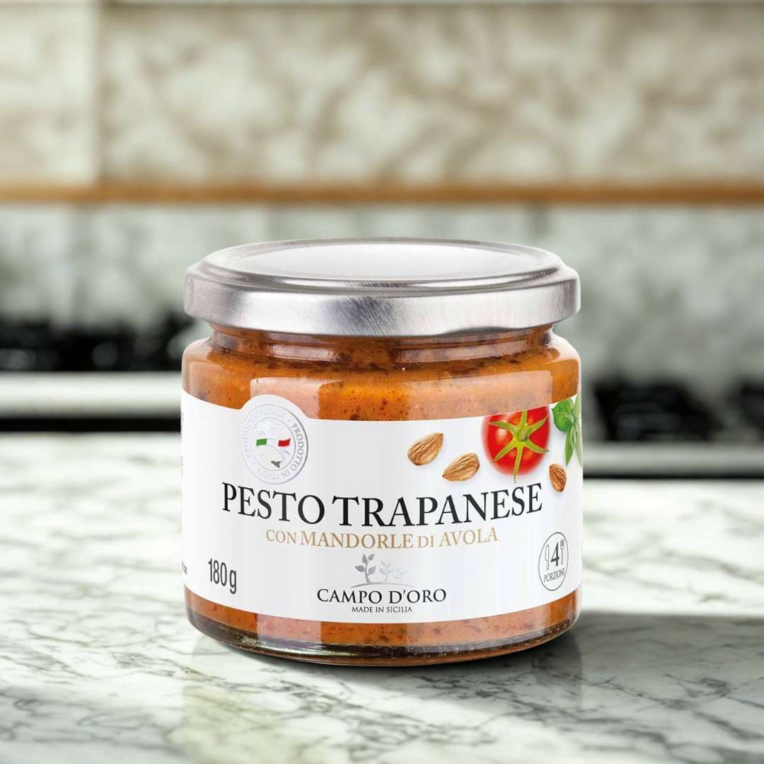 A Campo d'Oro Trapanese pesto Avola-i mandulával egy ízletes olasz pesto szósz, amely Avola-i mandulával készül, és igazi különlegességnek számít az olasz konyhában.