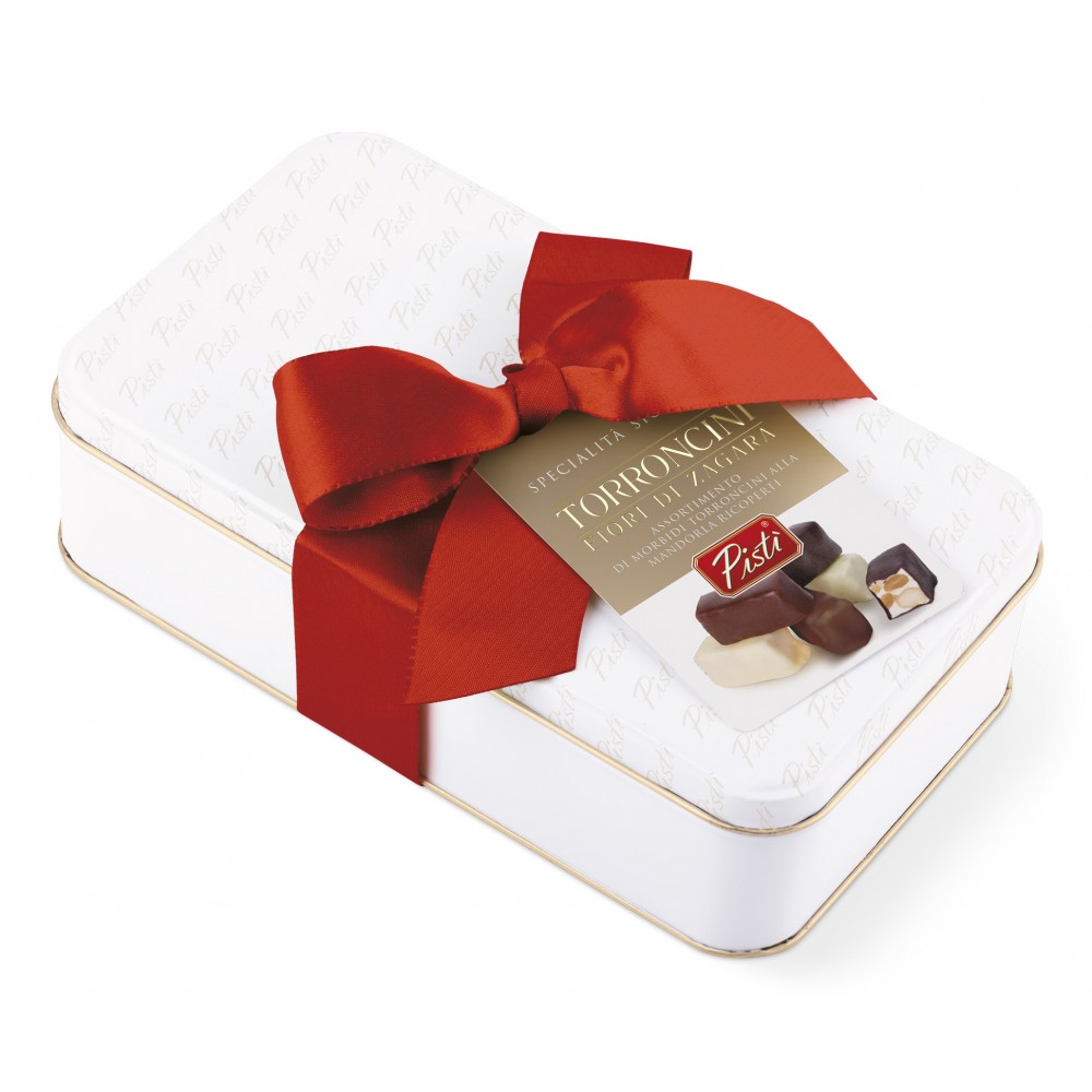 A Pisti Zagara-i puha torrone vegyes fémdobozban egy igazi olasz különlegesség, amely luxus csomagolásban ötvözi a tradíciót és az ízélményt.