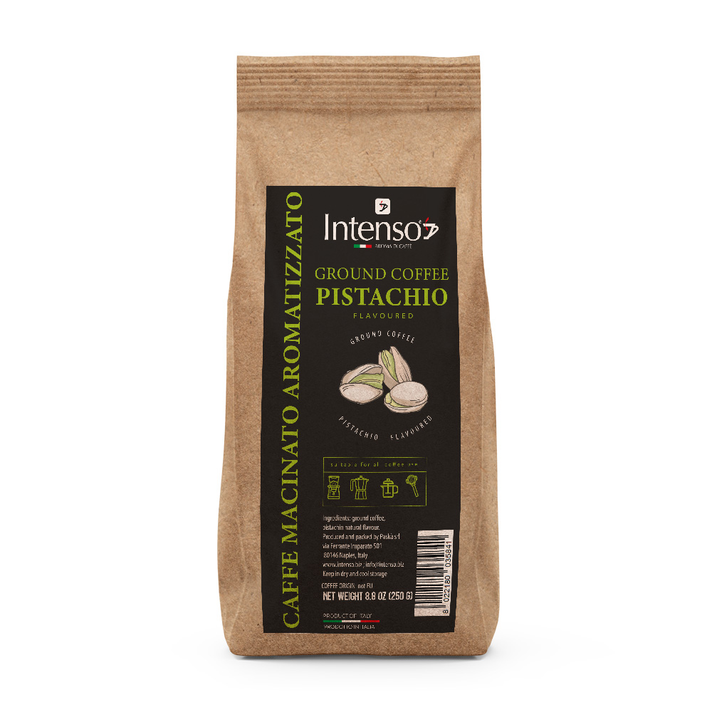 A Intenso kávé ízesített pisztáciás őrölt egy különleges keverék, mely a pikáns kávé ízét harmonikusan kombinálja a finom pisztácia aromájával.
