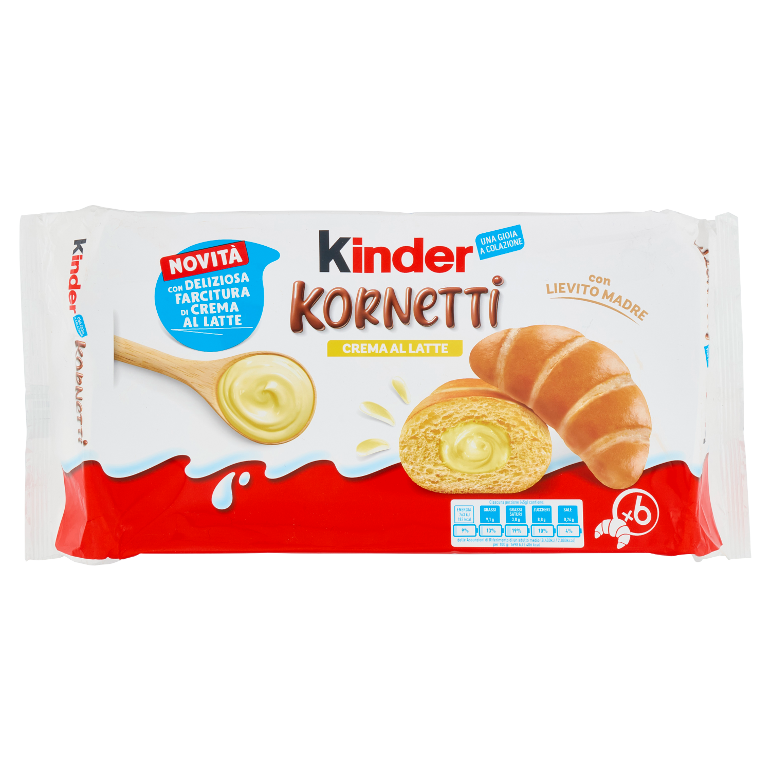 Fedezze fel a tejkrémes töltelékkel ellátott Kinder Kornetti kiválóságát! Krémes és ízletes töltelék, finom és burkolt ízzel, amelyet az anyaélesztővel készített puha leveles tészta burkol be.