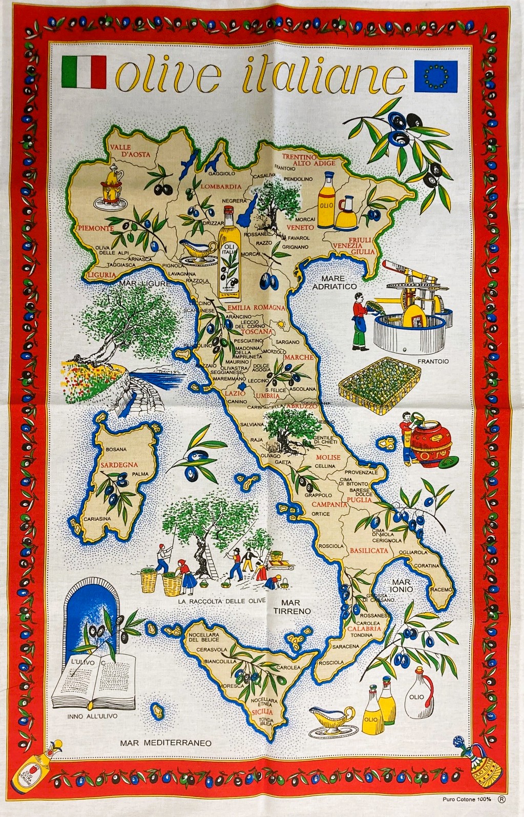 Kiváló minőségű olasz konyhai kiegészítő Olaszország térképpel, mely jelöli a regionális olajbogyó típusokat.
