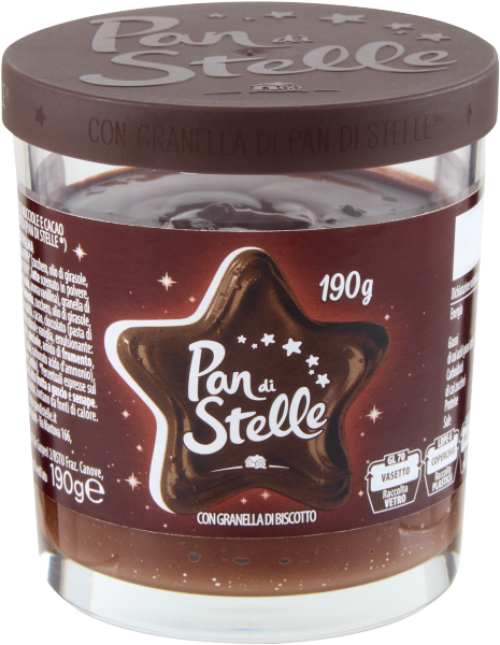 mogyorós kakaós krém (98%) (cukor, napraforgóolaj, olasz mogyoró (12%), alacsony zsírtartalmú kakaó (9,8%), sovány tejpor, kakaóvaj, emulgeálószer(szójalecitin), vanília aroma), Pan di Stelle kekszmorzsa (2%) (búzaliszt, cukor, napraforgóolaj, vaj, friss pasztőrözött tej, kakaó, csokoládé (kakaómassza, cukor, kakaóvaj, természetes vanília aroma, szójalecitin), friss tojás, méz, mogyoró, búzakeményítő), térfogat növelő szerek (szódabikarbóna (E500ii), ammónium-hidrogén-karbonát), só , aromák, tojásfehérje por, keményítő, Nyomokban tartalmazhat (diófélék, mustár)
