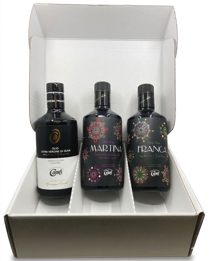 A Caroli extra szűz olívaolaj szett 3x500 ml három különböző olívaolajat tartalmaz, eltérő fajták és keverékek alapján: Coratina, Martina (Leccino és Cerasuola), valamint Franca (Coratina és Frantoio). A szett a pugliai olívaolaj-készítés különböző karaktereit mutatja be.