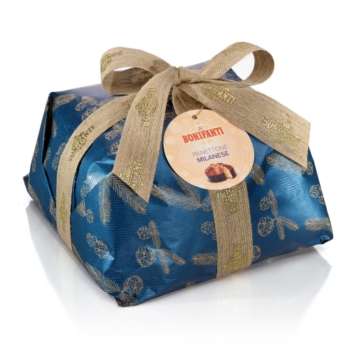 A Bonifanti panettone Milanese fenyő mintás kék egy egyedi olasz sütemény, mely kék fenyő mintával díszített, autentikus kézműves termék.