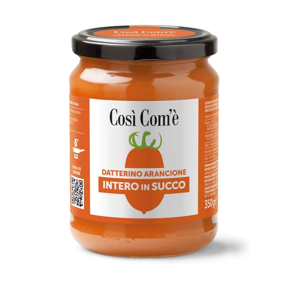 Fedezze fel a Cosicomé narancssárga datterino egyedi és élénk ízét, egy koktélparadicsomét, amelyet intenzív, kellemesen édes és frissítő jegyek jellemeznek. Saját levében tartósítva, ez a gyöngyszem minden kulináris alkotásodhoz színt és összetéveszthetetlen ízt ad.