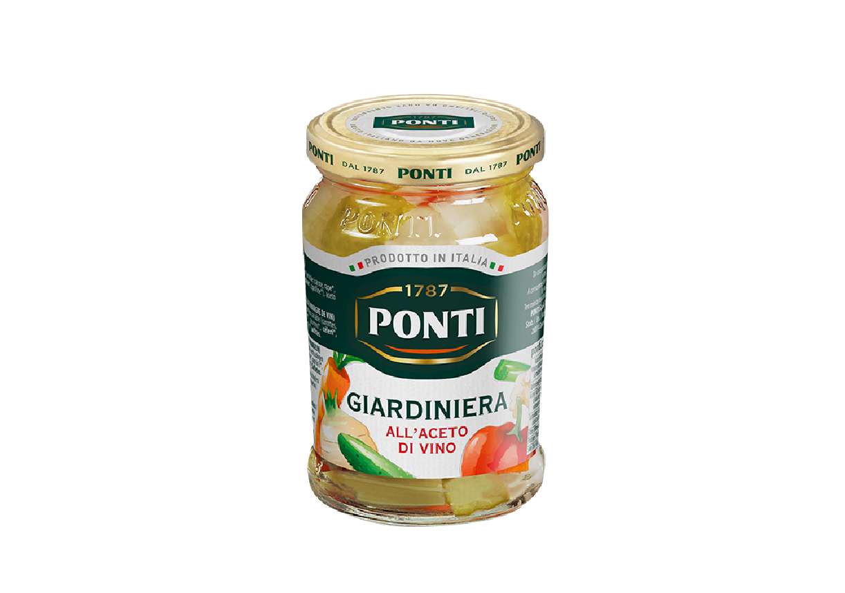 A Ponti Giardiniera zöldségek gazdag és intenzív ízvilága felidézi az olasz piacok hangulatát. A zöldségek tökéletes harmóniája minden falatban érezhető.