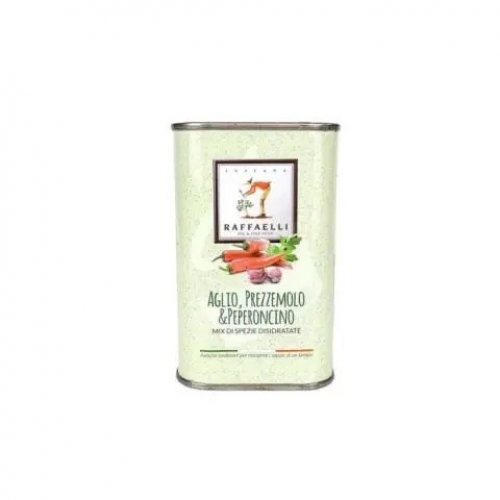 A Raffaelli fűszerkeverék fokhagyma/petrezselyem/peperon fém csomagolásban kapható autentikus olasz fűszerkeverék, amely különleges ízélményt nyújt az ételeknek.
