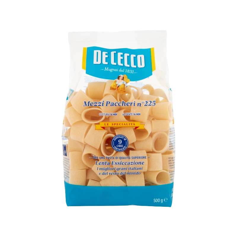 A De Cecco Mezzi Paccheri Durumbúza Tészta egy kiváló minőségű olasz tészta, melyet a hagyományos receptek alapján készítenek.