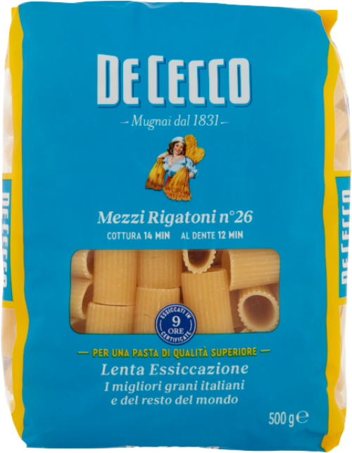A De Cecco mezzi rigatoni tészta prémium minőségű olasz tészta, amely garantálja az autentikus ízélményt és kiváló minőséget.