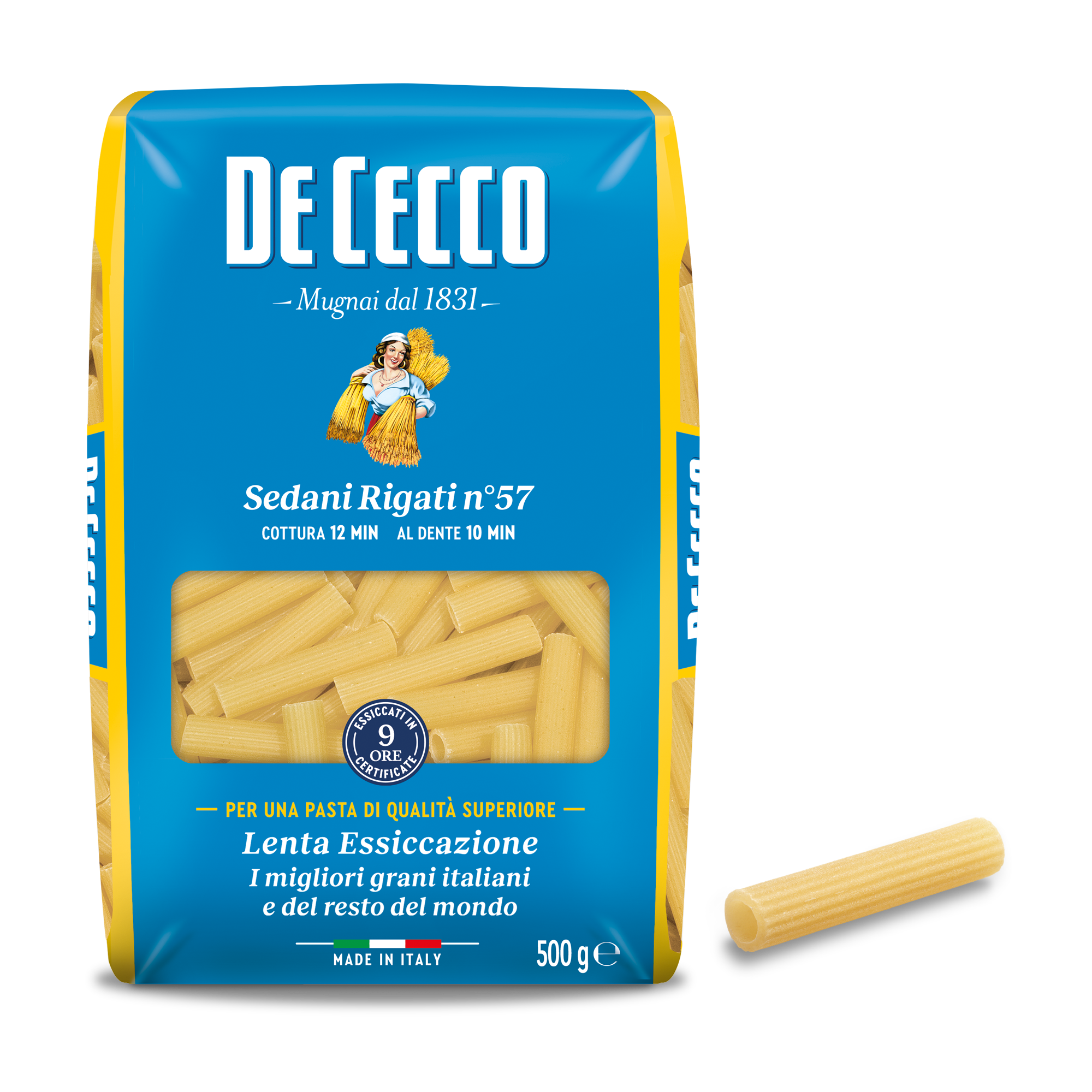 A De Cecco sedani rigati tészta olasz különlegesség, mely a hagyományos olasz ízek szerelmeseinek tökéletes választása.