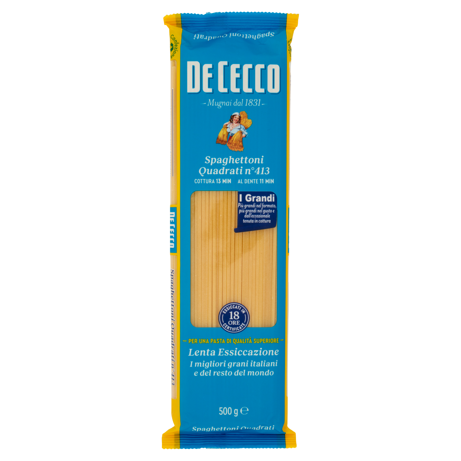 A De Cecco Spaghettoni Quadrati tészta a hagyományos olasz tésztaélményt modern formában kínálja, tökéletes választás az autentikus ízek szerelmeseinek.