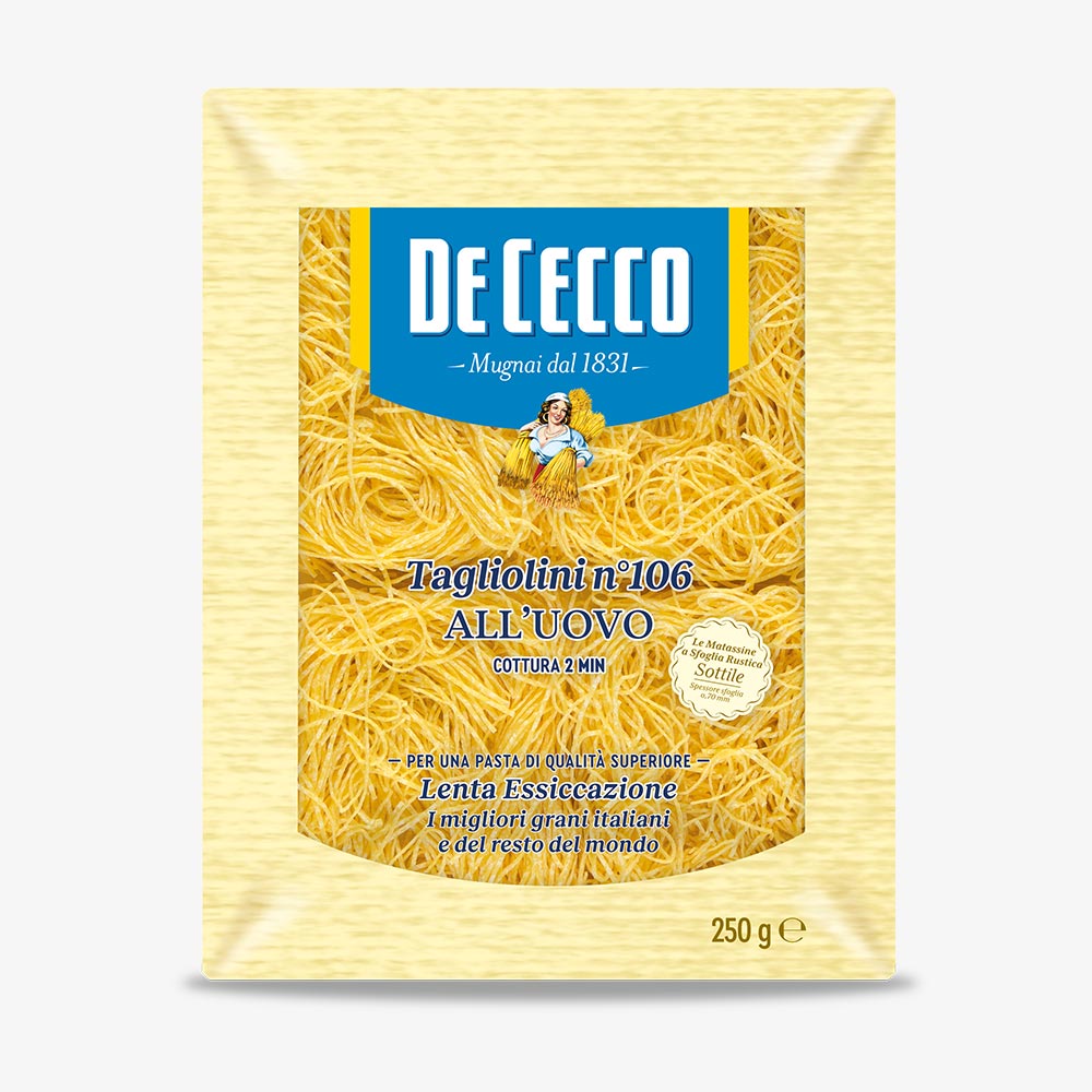 A De Cecco Nr.106 ideális választás mindennapi és ünnepi alkalmakra egyaránt. Kiválóan használható például tagliolini carbonara, tagliolini al tartufo vagy tagliolini all'arrabbiata elkészítéséhez.